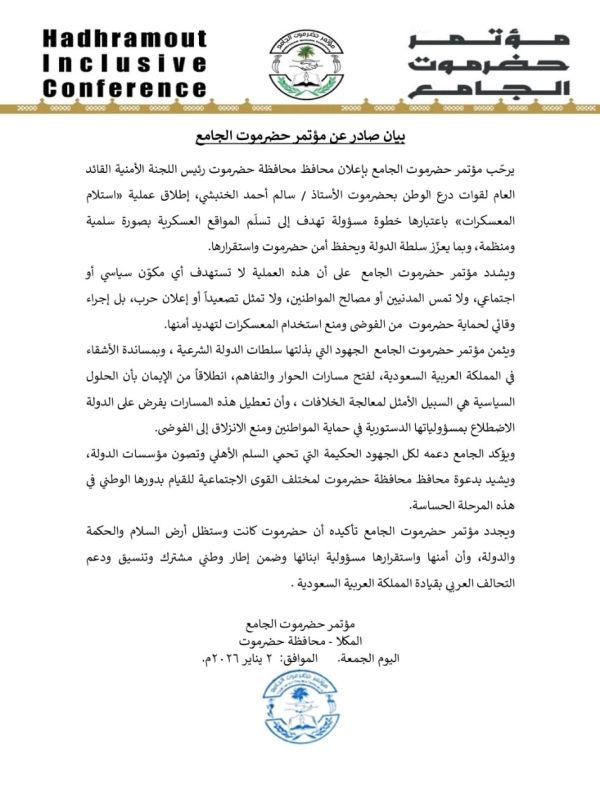 وأعرب المؤتمر عن دعمه لكل الجهود الحكيمة التي تحمي السلم الأهلي وتصون مؤسسات الدولة، مشيدا بدعوة محافظ محافظة حضرموت لمختلف القوى الاجتماعية للقيام بدورها الوطني في هذه المرحلة الحساسة.