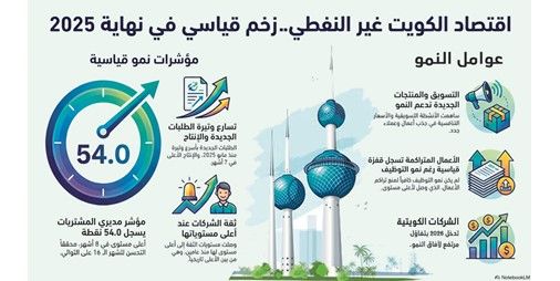 وأوضح أن مؤشر مديري المشتريات الرئيسي لدولة الكويت، وهو مؤشر مركب يقيس أداء القطاع الخاص غير النفطي، ويستخلص من خمسة مكونات رئيسية تشمل الطلبات الجديدة، والإنتاج، والتوظيف، ومواعيد تسليم الموردين، ومخزونات المشتريات، قد سجل مستوى 54 نقطة في ديسمبر 2025، مقارنة بـ53.4 نقطة في نوفمبر، ما يعكس تحسنا شهريا قويا، ويعد هذا التحسن السادس عشر على التوالي، والأكثر وضوحا منذ أبريل 2025.